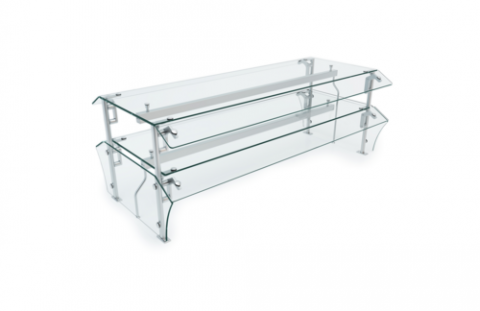 Versa-Gard, (2) tier, double-sided, self-service food protector with exposed upper display shelf, upper & lower glass angled front Bumper panels & end panels, 21” upper Tier shelf, 1/4" or 3/8” clear tempered glass, surface mount, NSF/ANSI