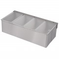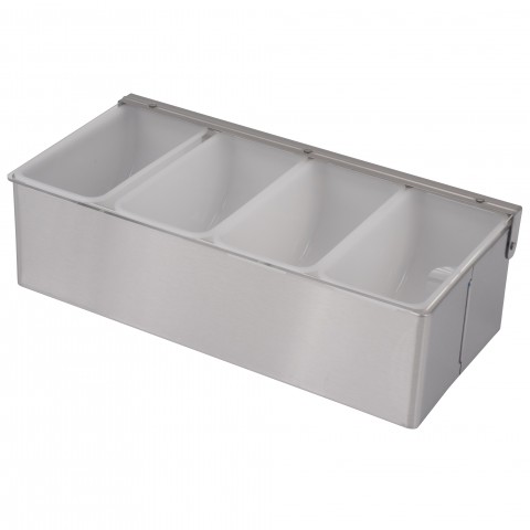 Condiment Server, countertop, 12" x 6" x 3" , heavy gauge stainless steel frame, 4 compartment, removable white plastic pint containers, with transparent lid riveted to stainless steel hinges
