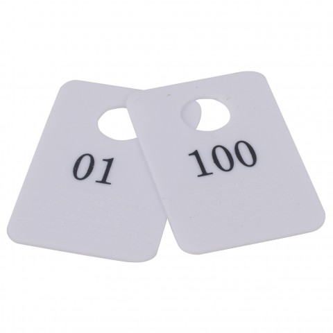 Coat Room Checks, plastic, with hanger hold and "Not Responsible" disclaimer (set is numbered 1-100 & includes 1 of each number)