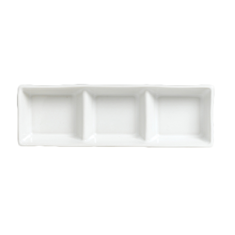 Divided Condiment Tray, 1 oz per well, 7-1/2" x 2-1/2", 3-compartment, rectangular, fully vitrified china, Anfora, Polar White (minimum = case quantity) (stock item)