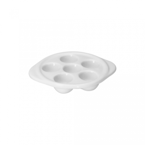Escargot Plate, 5-1/4" dia. (6-1/2" with lug handle) x 1"H, round, 6 holes, rolled edge, fully vitrified, oven & microwave safe, lead-free, ceramic, Ultra White (minimum = case quantity) (stock item)