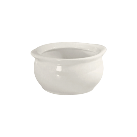 Onion Soup Bowl, 15 oz., 4-3/4" dia. (5-1/4" with handle) x 2-5/8"H, round, rolled edge, fully vitrified, oven & microwave safe, lead-free, ceramic, White (minimum = case quantity) (stock item)