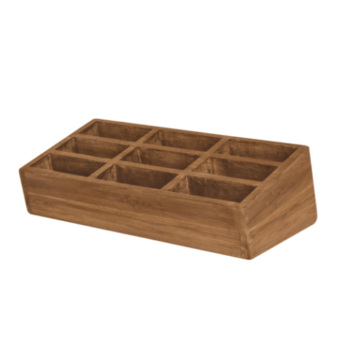 Angled Condiment Caddy, 9-compartments, 12.75" x 6.5" x 4"H, wood, natural teak, DW Haber, Fusion Buffet System (minimum = case quantity) (stock item)