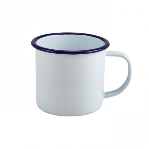 Mug, 12-1/2 oz., 4-1/2"L x 3-1/2"W x 3-1/4"H, with handle, dishwasher & oven safe, enamelware, white with blue rim, Genware London, GW Enamel (minimum = case quantity) (stock item)