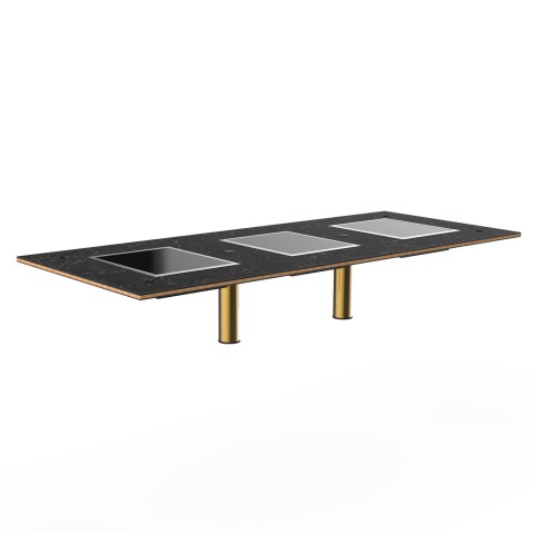 Mogogo Buffet Solutions Modular Nemco Induction Warming Top, 71" x 29-1/2", triple, drop in, touch control, Nero Marquina marble BHP high pressure laminate with bamboo core top, brushed brass segments, 270 watt, 120v, 2.2 amp