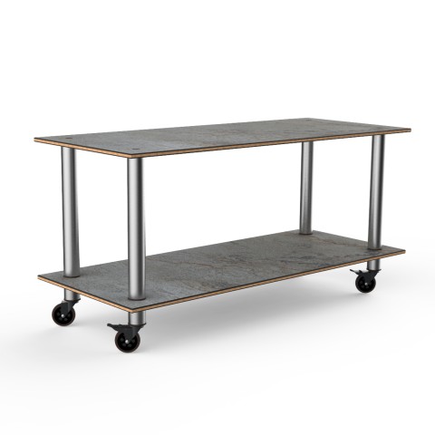 Mogogo Buffet Solutions Modular Serving Table, 2-tier, 71" x 29-1/2" x 35"H, rectangular, large, gray slate BHP high pressure laminate with bamboo core top, brushed stainless steel casters, knockdown