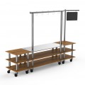 Mogogo Buffet Solutions Modular Pro Salsa Bar Station, 3-tier, 130" x 29-1/2" x 96"H, rectangular, stainless steel workspace, with sign post & chalkboard, high density bamboo finish, brushed stainless steel casters, knockdown