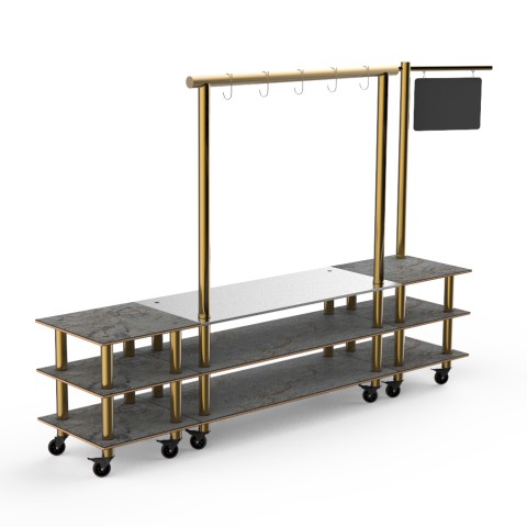 Mogogo Buffet Solutions Modular Pro Salsa Bar Station, 3-tier, 130" x 29-1/2" x 96"H, rectangular, stainless steel workspace, with sign post & chalkboard, grey slate BHP high pressure laminate with bamboo core top, brushed brass casters, knockdown