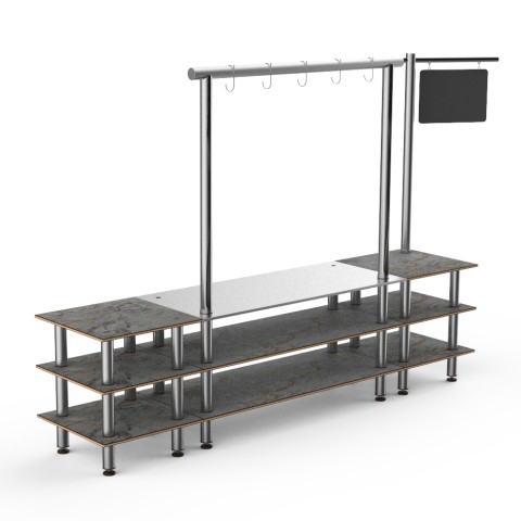 Mogogo Buffet Solutions Modular Pro Salsa Bar Station, 3-tier, 130" x 29-1/2" x 96"H, rectangular, stainless steel workspace, with sign post & chalkboard, grey slate BHP high pressure laminate with bamboo core top, brushed stainless steel legs, knockdown
