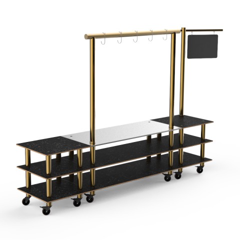 Mogogo Buffet Solutions Modular Pro Salsa Bar Station, 3-tier, 130" x 29-1/2" x 96"H, rectangular, stainless steel workspace, with sign post & chalkboard, Nero Marquina marble BHP high pressure laminate with bamboo core top, brushed brass casters, knockdo
