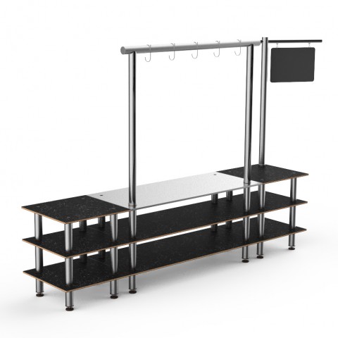 Mogogo Buffet Solutions Modular Pro Salsa Bar Station, 3-tier, 130" x 29-1/2" x 96"H, rectangular, stainless steel workspace, with sign post & chalkboard, Nero Marquina marble BHP high pressure laminate with bamboo core top, brushed stainless steel legs,