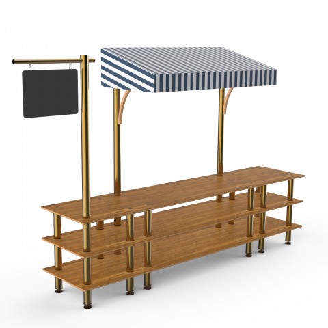 Mogogo Buffet Solutions Modular Pro Salsa Bar Station, 3-tier, 130" x 29-1/2" x 96"H, rectangular, with sign post & chalkboard, high density bamboo finish, white/blue canopy, brushed brass legs, knockdown