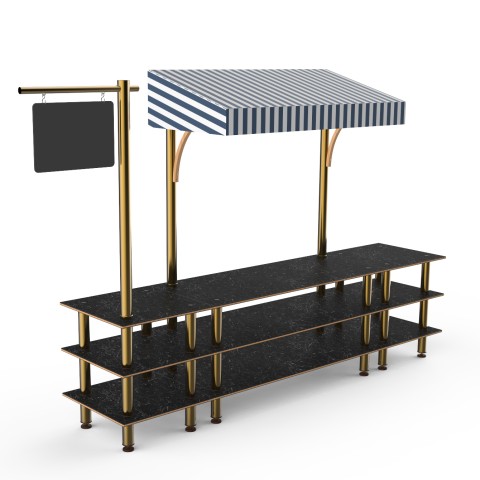 Mogogo Buffet Solutions Modular Pro Salsa Bar Station, 3-tier, 130" x 29-1/2" x 96"H, rectangular, with sign post & chalkboard, Nero Marquina marble BHP high pressure laminate with bamboo core top, white/blue canopy, brushed brass legs, knockdown