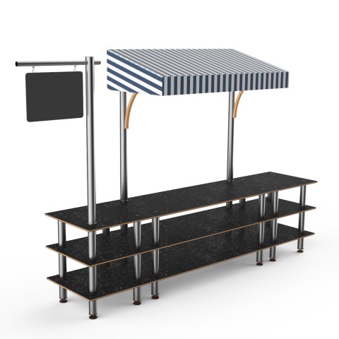 Mogogo Buffet Solutions Modular Pro Salsa Bar Station, 3-tier, 130" x 29-1/2" x 96"H, rectangular, with sign post & chalkboard, Nero Marquina marble BHP high pressure laminate with bamboo core top, white/blue canopy, brushed stainless steel legs, knockdow