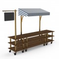 Mogogo Buffet Solutions Modular Pro Salsa Bar Station, 3-tier, 130" x 29-1/2" x 96"H, rectangular, with sign post & chalkboard, Bengali mango wood BHP high pressure laminate with bamboo core top, white/blue canopy, brushed brass casters, knockdown