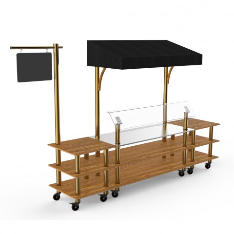 Mogogo Buffet Solutions Modular Classic Canopy Station, 3-tier, 130" x 29-1/2" x 96"H, rectangular, with stainless steel workspace, breath guard, sign post & chalkboard, high density bamboo finish, brushed brass segments, black textile canopy, casters (st