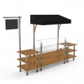 Mogogo Buffet Solutions Modular Classic Canopy Station, 3-tier, 130" x 29-1/2" x 96"H, rectangular, with stainless steel workspace, breath guard, sign post & chalkboard, high density bamboo finish, brushed stainless steel segments, black textile canopy, a