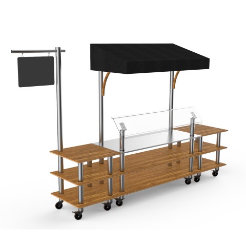 Mogogo Buffet Solutions Modular Classic Canopy Station, 3-tier, 130" x 29-1/2" x 96"H, rectangular, with stainless steel workspace, breath guard, sign post & chalkboard, high density bamboo finish, brushed stainless steel segments, black textile canopy, c