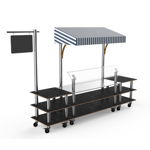 Mogogo Buffet Solutions Modular Classic Canopy Station, 3-tier, 130" x 29-1/2" x 96"H, rectangular, with stainless steel workspace, breath guard, sign post & chalkboard, Nero Marquina marble BHP high pressure laminate with bamboo core top, brushed stainle