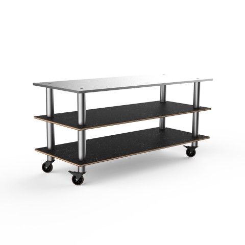 Mogogo Buffet Solutions Modular Pro Station, 3-tier, 71" x 29-1/2" x 33"H, rectangular, stainless steel top surface, Nero Marquina marble BHP high pressure laminate with bamboo core top, brushed stainless steel casters, knockdown (covers not included) (st