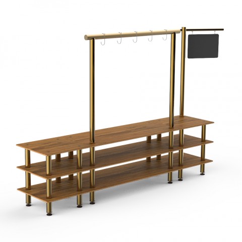 Mogogo Buffet Solutions Modular Salsa Bar, 3-tier, 130" x 29-1/2" x 96"H, rectangular, with sign post, & (5) hooks, high density bamboo finish, brushed brass legs, knockdown