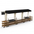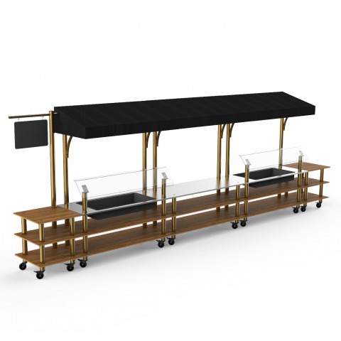 Mogogo Buffet Solutions Modular Pro Fish Market, 3-tier, 272" x 34" x 95-1/2"H, rectangular, stainless steel top, (2) ice bins, (2) breath guards, high density bamboo finishs, black canopy, brushed brass casters, knockdown
