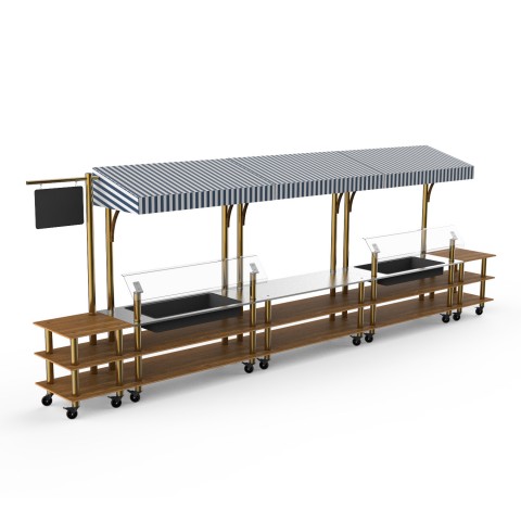Mogogo Buffet Solutions Modular Pro Fish Market, 3-tier, 272" x 34" x 95-1/2"H, rectangular, stainless steel top, (2) ice bins, (2) breath guards, high density bamboo finishs, white/blue canopy, brushed brass casters, knockdown