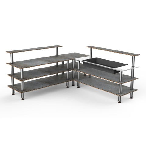 Mogogo Buffet Solutions Modular Cooling Corner Station, 3-tier, 100-1/2" x 100-1/2" x 47-1/2"H, rectangular, stainless steel top with insulated ice bin, (2) back shelves, grey slate BHP high pressure laminate with bamboo core top, brushed stainless steel