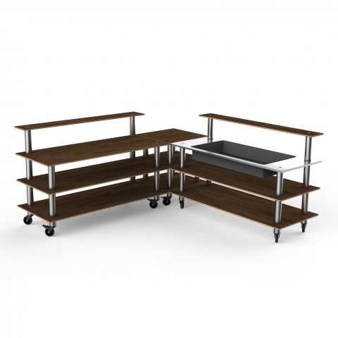 Mogogo Buffet Solutions Modular Cooling Corner Station, 3-tier, 100-1/2" x 100-1/2" x 47-1/2"H, rectangular, stainless steel top with insulated ice bin, (2) back shelves, Bengali mango wood BHP high pressure laminate with bamboo core top, brushed stainles