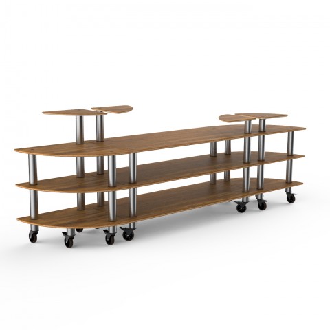 Mogogo Buffet Solutions Modular Classic Buffet Station, 3-tier, 130" x 29-1/2" x 47-1/2"H, curved, double sided, (4) triangular shelves, high density bamboo finish, brushed stainless steel casters, knockdown