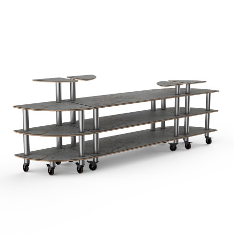 Mogogo Buffet Solutions Modular Classic Buffet Station, 3-tier, 130" x 29-1/2" x 47-1/2"H, curved, double sided, (4) triangular shelves, grey slate BHP high pressure laminate with bamboo core top, brushed stainless steel casters, knockdown