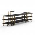 Mogogo Buffet Solutions Modular Classic Buffet Station, 3-tier, 130" x 29-1/2" x 47-1/2"H, curved, double sided, (4) triangular shelves, Nero Marquina marble BHP high pressure laminate with bamboo core top, brushed brass casters, knockdown