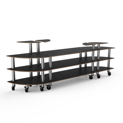 Mogogo Buffet Solutions Modular Classic Buffet Station, 3-tier, 130" x 29-1/2" x 47-1/2"H, curved, double sided, (4) triangular shelves, Nero Marquina marble BHP high pressure laminate with bamboo core top, brushed stainless steel casters, knockdown (stoc