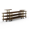 Mogogo Buffet Solutions Modular Classic Buffet Station, 3-tier, 130" x 29-1/2" x 47-1/2"H, curved, double sided, (4) triangular shelves, Bengali mango wood BHP high pressure laminate with bamboo core top, brushed brass casters, knockdown