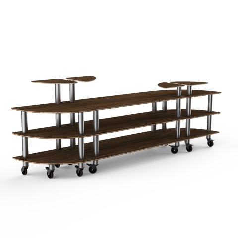 Mogogo Buffet Solutions Modular Classic Buffet Station, 3-tier, 130" x 29-1/2" x 47-1/2"H, curved, double sided, (4) triangular shelves, Bengali mango wood BHP high pressure laminate with bamboo core top, brushed stainless steel casters, knockdown