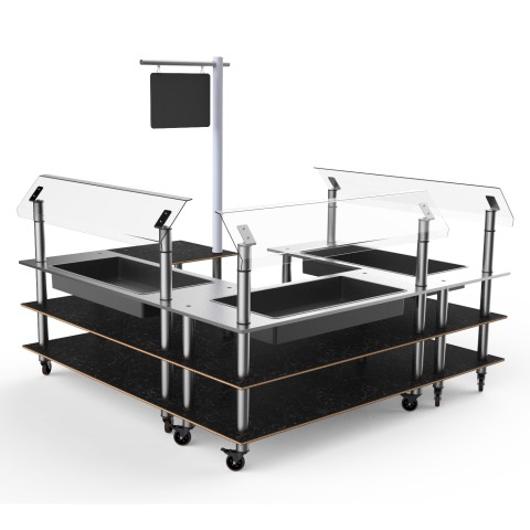 Mogogo Buffet Solutions Modular Chilled Salad Station, 3-tier, 100-1/2" x 100-1/2" x 94-1/2"H, rectangular, self-service, (3) stainless steel tops with insulated ice bin, (3) breath guards, & sign post, Nero Marquina marble BHP high pressure laminate with