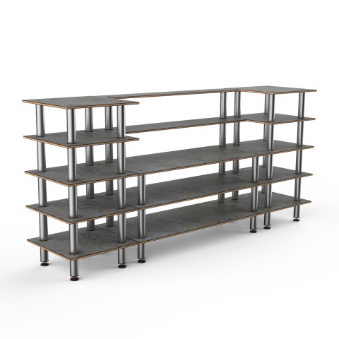 Mogogo Buffet Solutions Modular Bread & Pastries Station, 5-tier, 130" x 29-1/2" x 60-1/2"H, rectangular, grey slate BHP high pressure laminate with bamboo core top, brushed stainless steel legs, knockdown