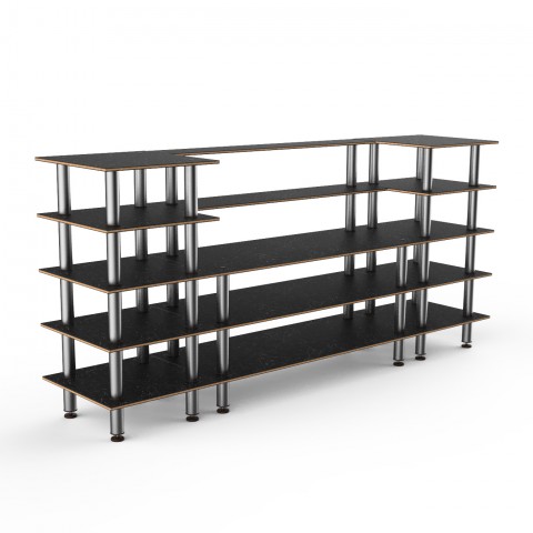 Mogogo Buffet Solutions Modular Bread & Pastries Station, 5-tier, 130" x 29-1/2" x 60-1/2"H, rectangular, Nero Marquina marble BHP high pressure laminate with bamboo core top, brushed stainless steel legs, knockdown