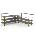 Mogogo Buffet Solutions Modular Pro Corner Station, 3-tier, 100-1/2" x 100-1/2" x 47-1/2"H, rectangular, stainless steel workspace, (2) back shelves, grey slate BHP high pressure laminate with bamboo core top, brushed brass legs, knockdown