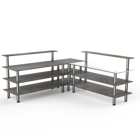 Mogogo Buffet Solutions Modular Pro Corner Station, 3-tier, 100-1/2" x 100-1/2" x 47-1/2"H, rectangular, stainless steel workspace, (2) back shelves, grey slate BHP high pressure laminate with bamboo core top, brushed stainless steel legs, knockdown (stoc