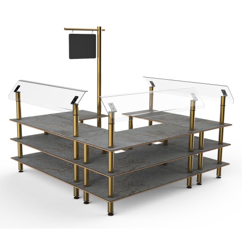Mogogo Buffet Solutions Modular Salad Station, 3-tier, 100-1/2" x 100-1/2" x 94"H, rectangular, self serve, (3) breath guards, with sign post & chalkboard, grey slate BHP high pressure laminate with bamboo core top, brushed brass legs, knockdownt