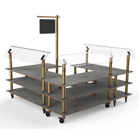 Mogogo Buffet Solutions Modular Salad Station, 3-tier, 100-1/2" x 100-1/2" x 94"H, rectangular, self serve, (3) breath guards, with sign post & chalkboard, grey slate BHP high pressure laminate with bamboo core top, brushed brass casters, knockdown