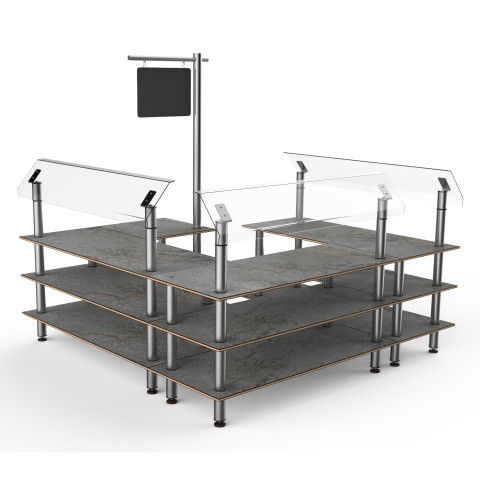 Mogogo Buffet Solutions Modular Salad Station, 3-tier, 100-1/2" x 100-1/2" x 94"H, rectangular, self serve, (3) breath guards, with sign post & chalkboard, grey slate BHP high pressure laminate with bamboo core top, brushed stainless steel legs, knockdown