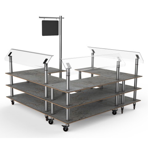 Mogogo Buffet Solutions Modular Salad Station, 3-tier, 100-1/2" x 100-1/2" x 94"H, rectangular, self serve, (3) breath guards, with sign post & chalkboard, grey slate BHP high pressure laminate with bamboo core top, brushed stainless steel casters, knockd