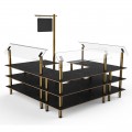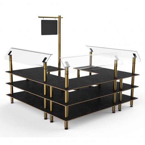 Mogogo Buffet Solutions Modular Salad Station, 3-tier, 100-1/2" x 100-1/2" x 94"H, rectangular, self serve, (3) breath guards, with sign post & chalkboard, Nero Marquina marble BHP high pressure laminate with bamboo core top, brushed brass legs, knockdown
