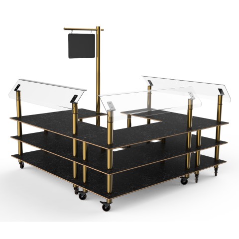 Mogogo Buffet Solutions Modular Salad Station, 3-tier, 100-1/2" x 100-1/2" x 94"H, rectangular, self serve, (3) breath guards, with sign post & chalkboard, Nero Marquina marble BHP high pressure laminate with bamboo core top, brushed brass casters, knockd