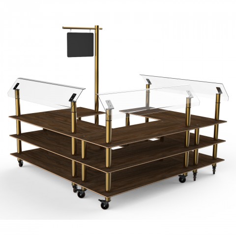 Mogogo Buffet Solutions Modular Salad Station, 3-tier, 100-1/2" x 100-1/2" x 94"H, rectangular, self serve, (3) breath guards, with sign post & chalkboard, Bengali mango wood BHP high pressure laminate with bamboo core top, brushed brass casters, knockdow