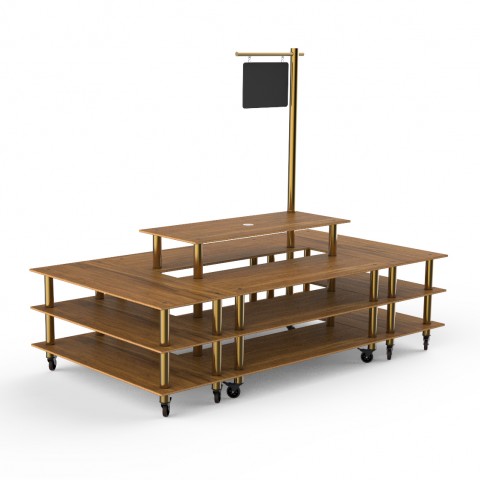 Mogogo Buffet Solutions Modular Market Square, 4-tier, 130" x 71" x 107"H, rectangular, with sign post & chalkboard, high density bamboo finish, brushed brass casters, knockdown