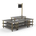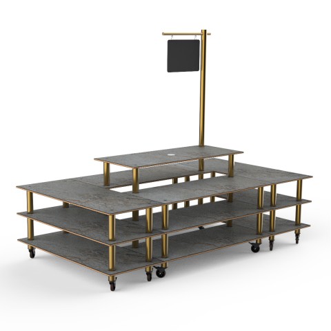 Mogogo Buffet Solutions Modular Market Square, 4-tier, 130" x 71" x 107"H, rectangular, with sign post & chalkboard, grey slate BHP high pressure laminate with bamboo core top, brushed brass casters, knockdown