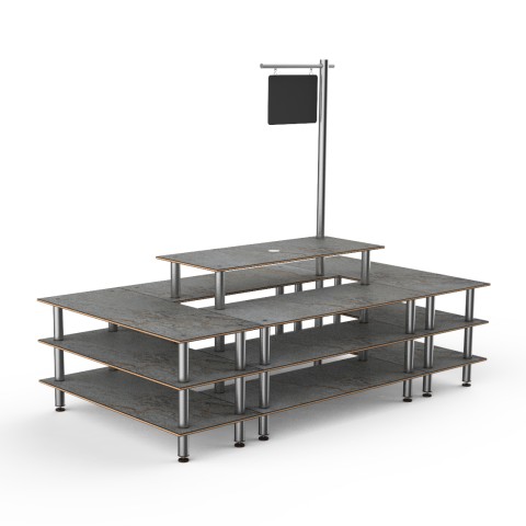 Mogogo Buffet Solutions Modular Market Square, 4-tier, 130" x 71" x 107"H, rectangular, with sign post & chalkboard, grey slate BHP high pressure laminate with bamboo core top, brushed stainless steel legs, knockdown